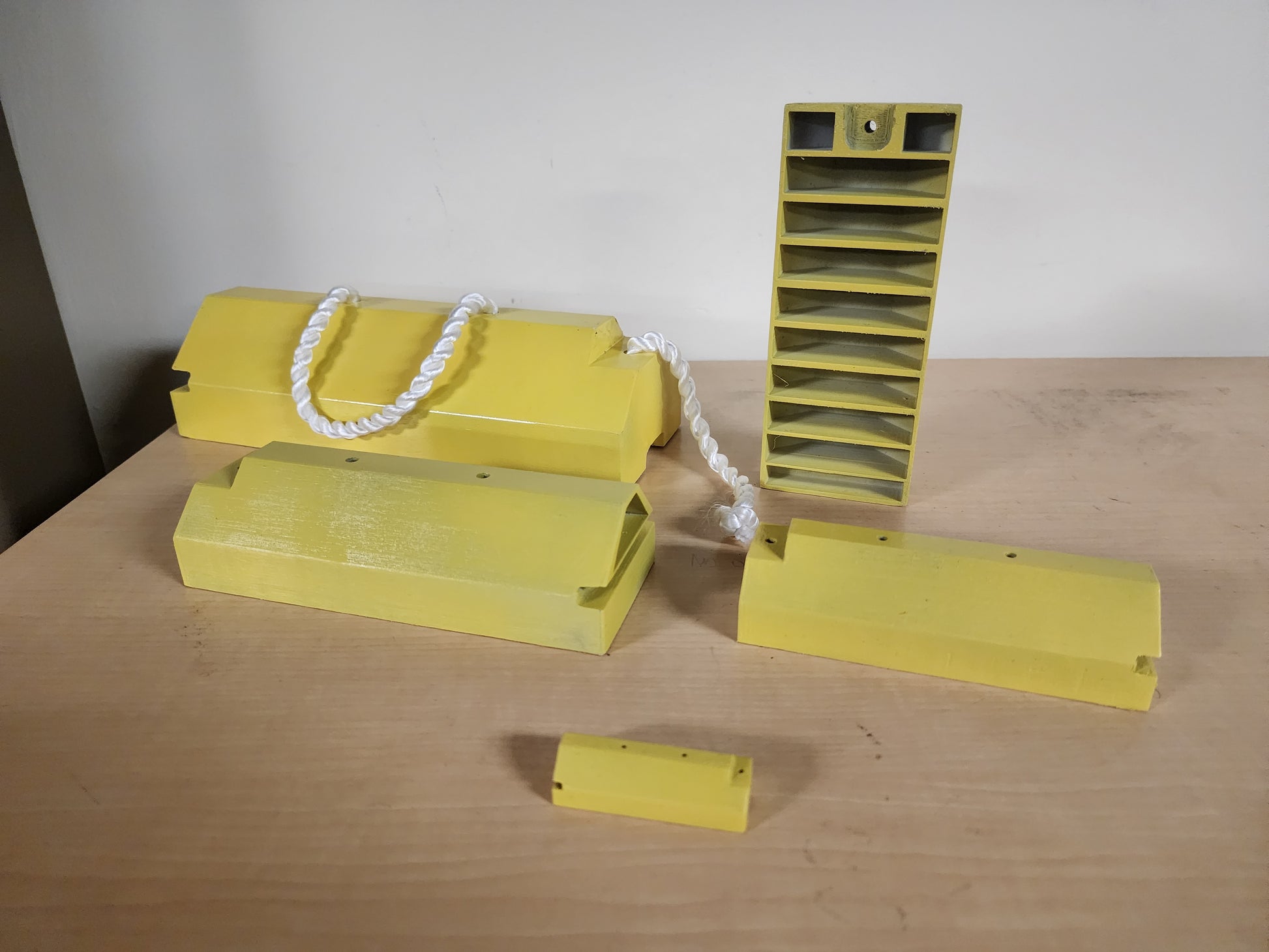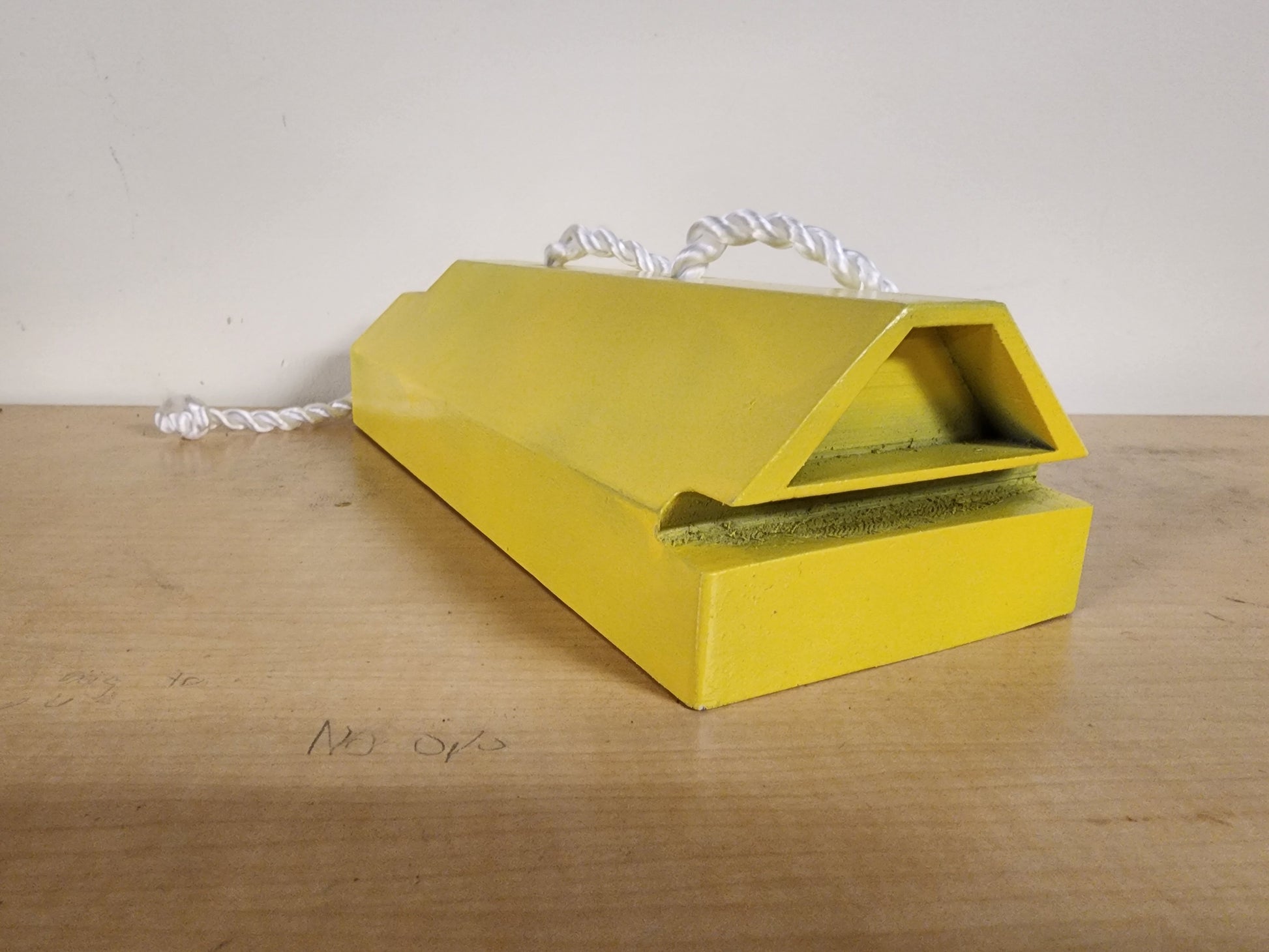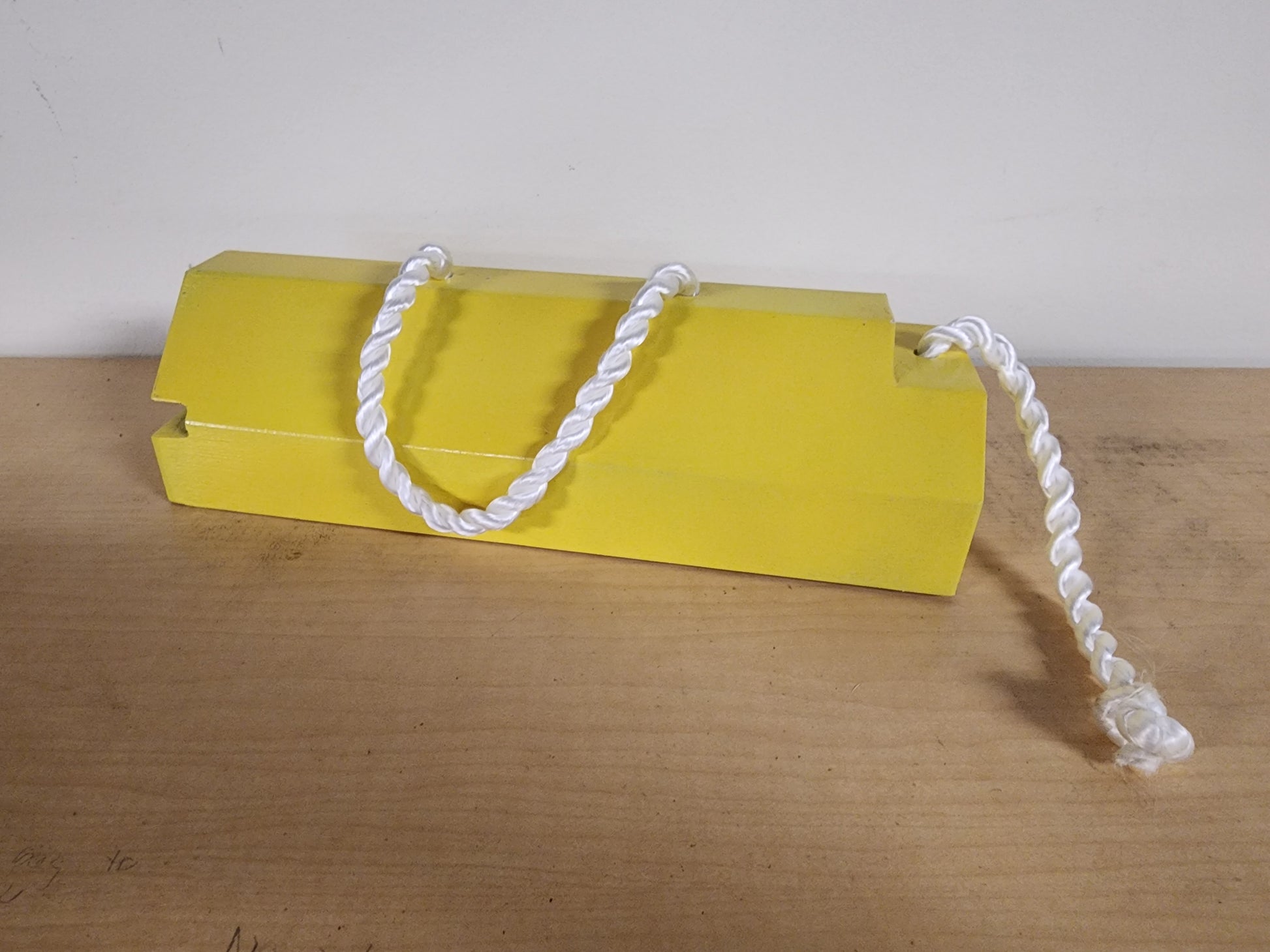 Customization and scaling available on request. Product default order is printed from PETG, sanded and smoothed, and provided a simple yellow paint job and carry rope.