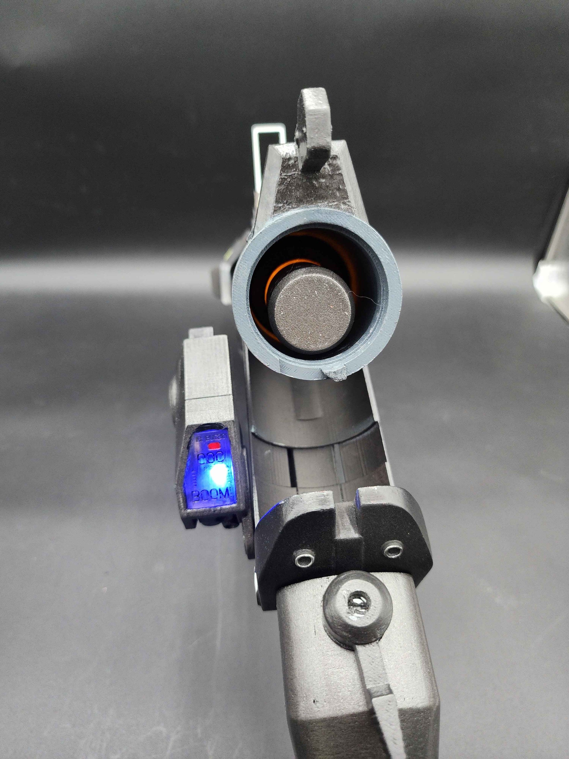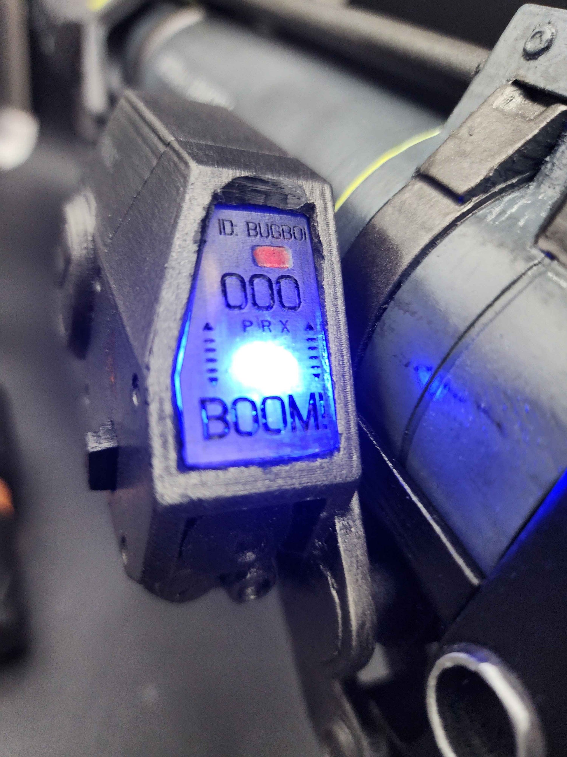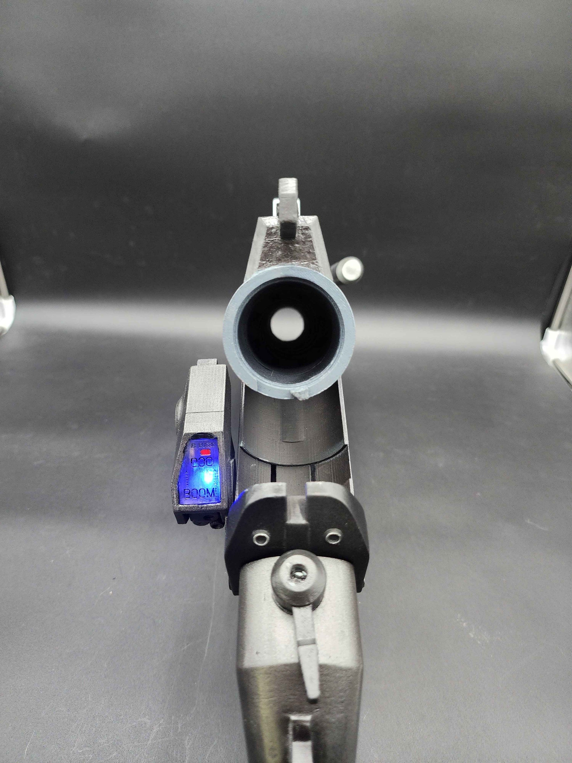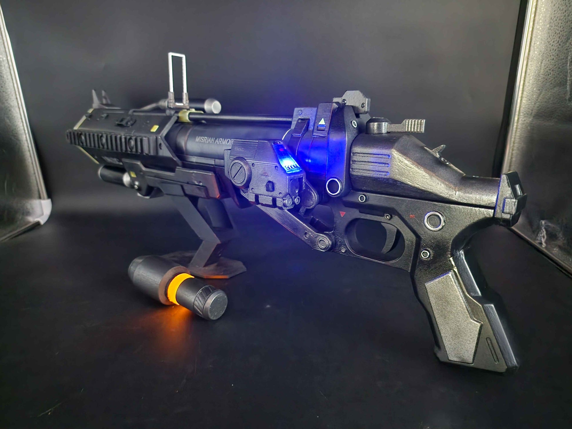 This was super fun to work on. With a functional break action and loadable grenade space, folding forward grip, working trigger, LED illuminated grenades, and my own custom work on the rangefinder module on the side to include an LED and custom text (shown design was customized for a friend), this is my most complex and proudest project at the time of my posting this.